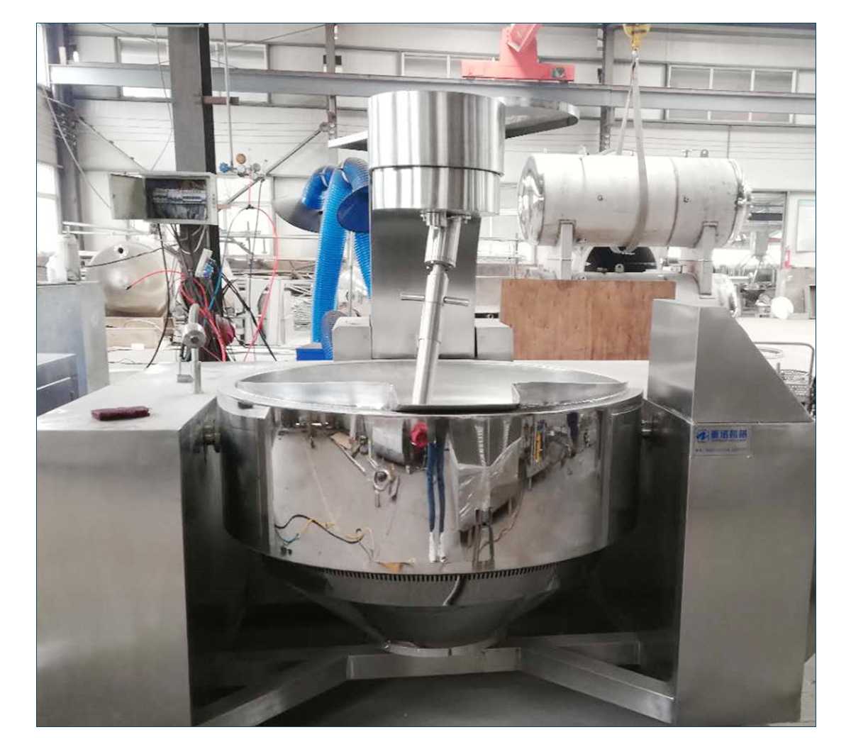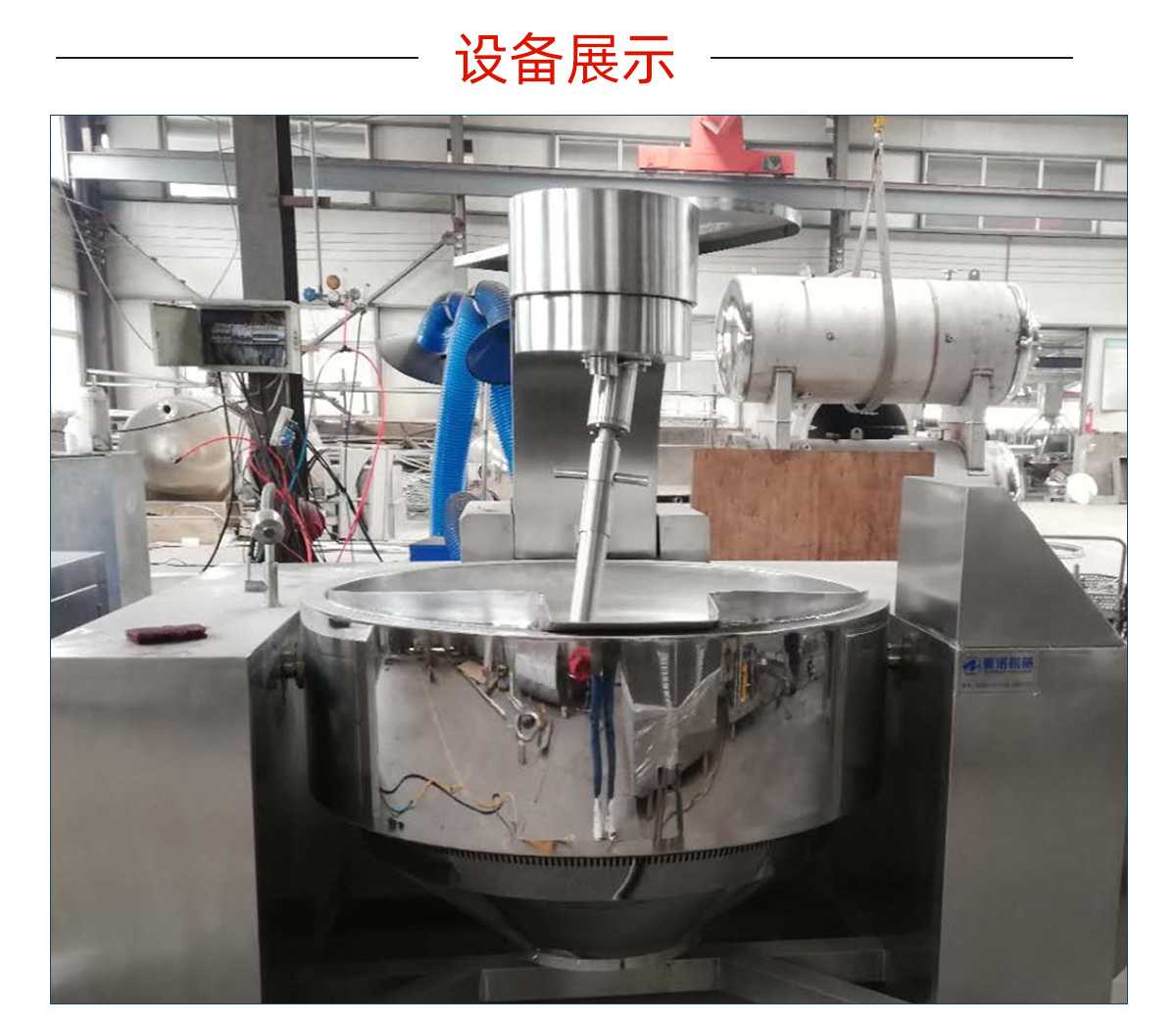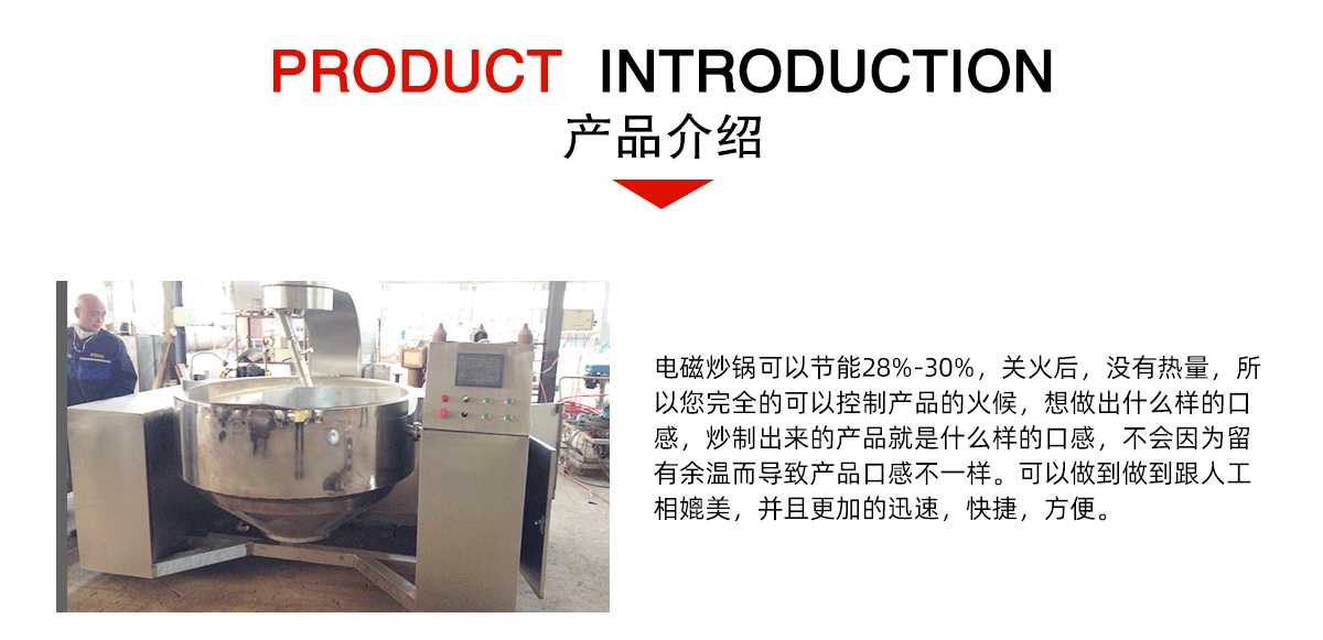 本产品锅体为一次冲压成型的半球不锈钢锅体,采用电磁加热形式,搅拌方式采用特殊的倾斜传动,使用的行星搅拌器与锅体充分接触,实现传动公转与自传的不整数传动比,使锅内无搅拌死角。使用先进的传动与密封结构,使传动部分与国内洁净,卫生。采用变频调速动力,运行更平稳、电磁加热形式打破了明火烹调方式,具有升温快、无明火、无烟尘、无有害气体,对周围环境不产生热辐射,安全性好和外观美观等特点,是性能优良的食品加工设备。