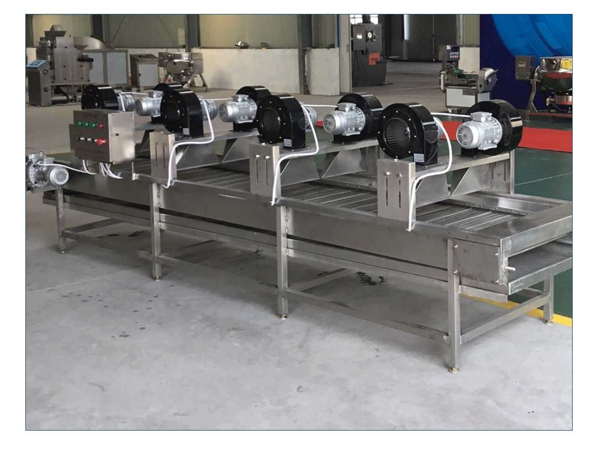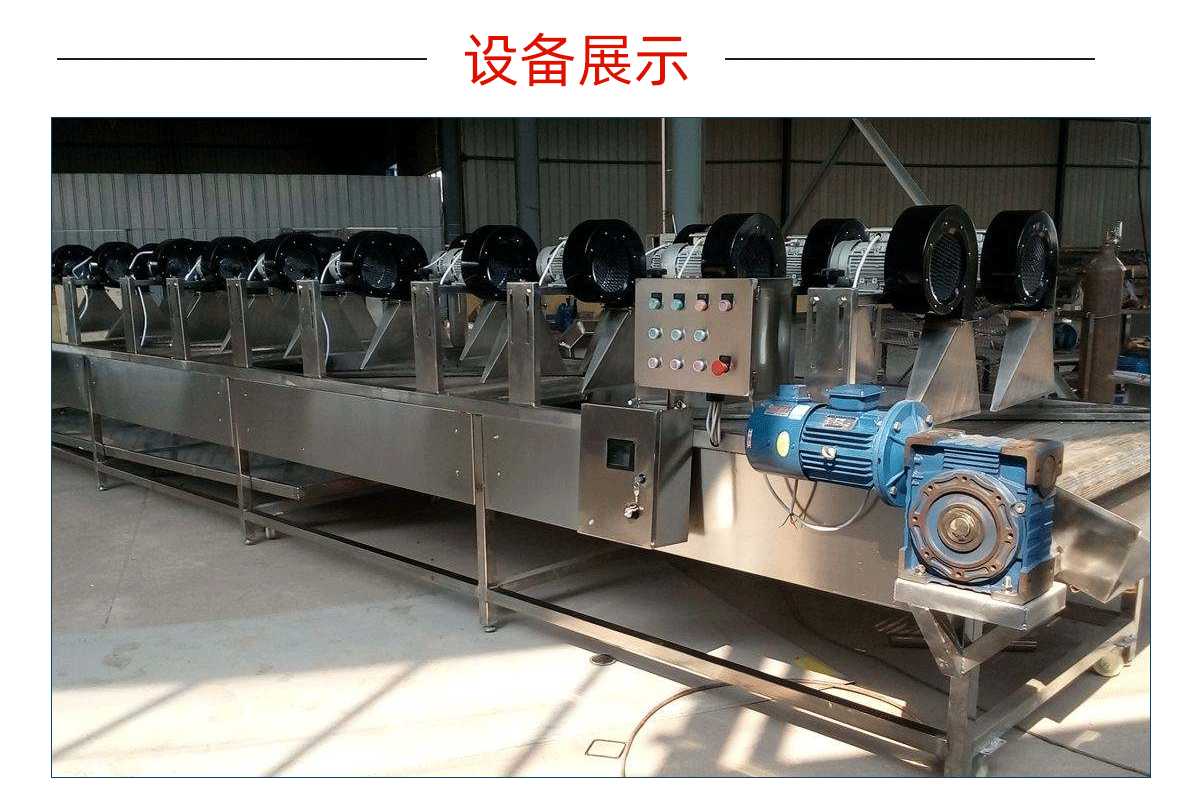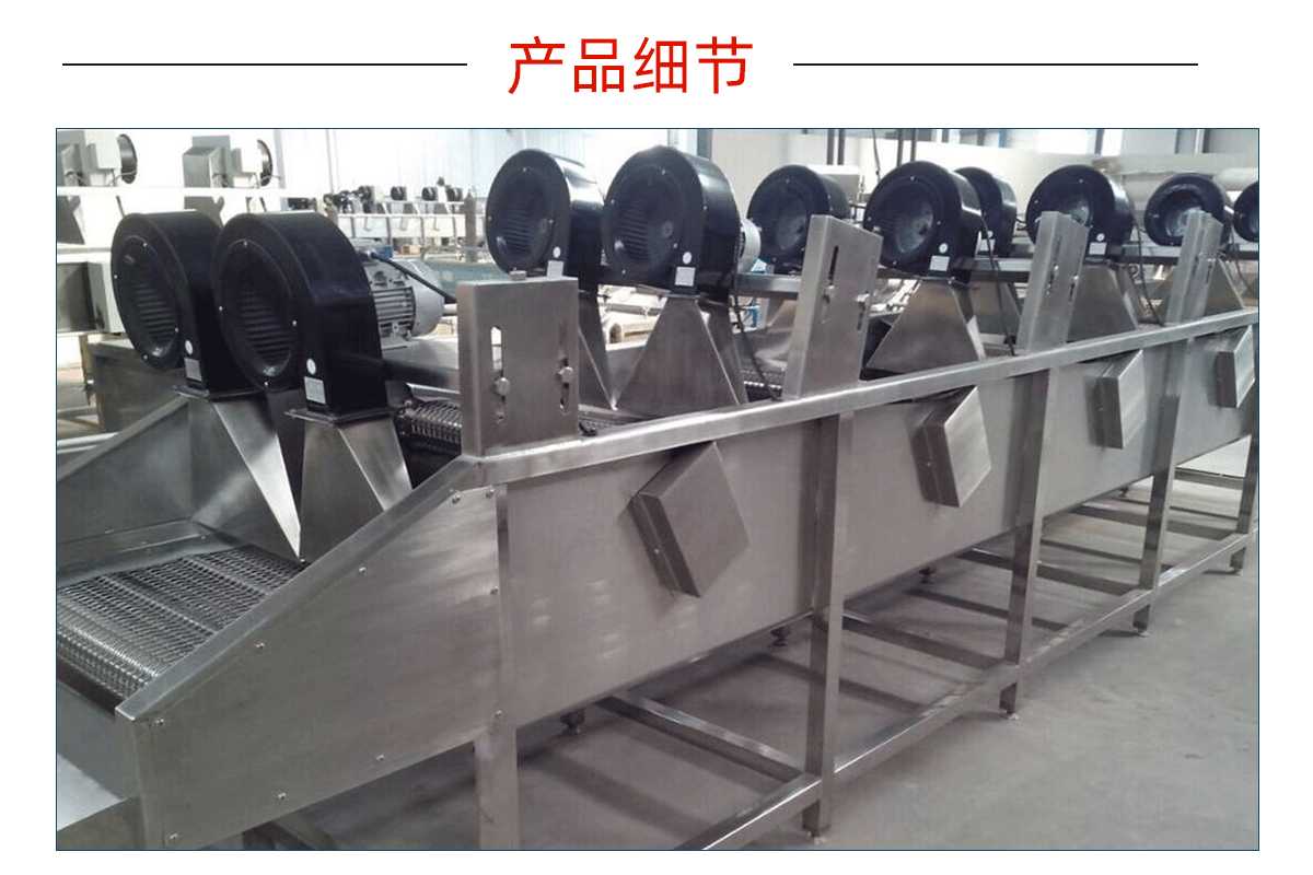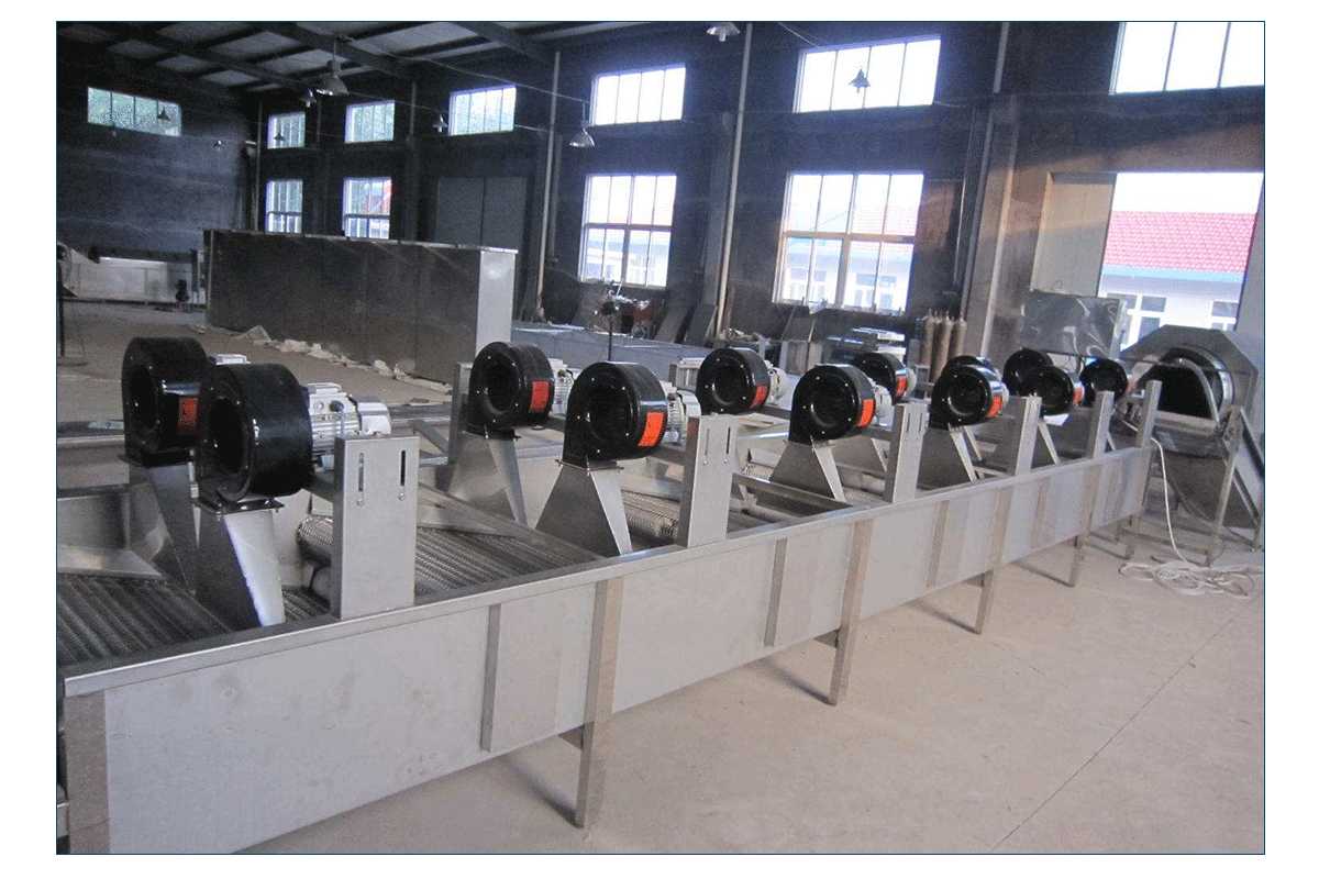 3. 风干机除水后可直接装箱,风干机实现连续作业(与连续工作杀菌机配套使用),只需将杀菌后的产品放入输送网带,经风干机产生的气流经喷嘴喷射而出,吹干风温为常温,风干机有效保护物料本身的色泽和品质。从而达到包装除水、除油渍、水垢等效果,即可装箱入库。