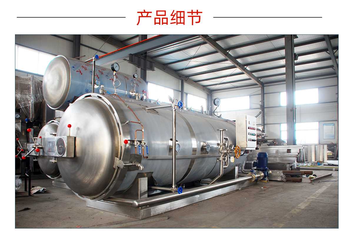一般罐头食品厂对罐头作常压水煮加热杀菌处理时都采用本形式的卧式杀菌锅,本设备通过引入压缩空气可实现反压杀菌。如冷却需在锅内进行,须用水泵打入锅顶部的喷水管(或采用水循环系统)。