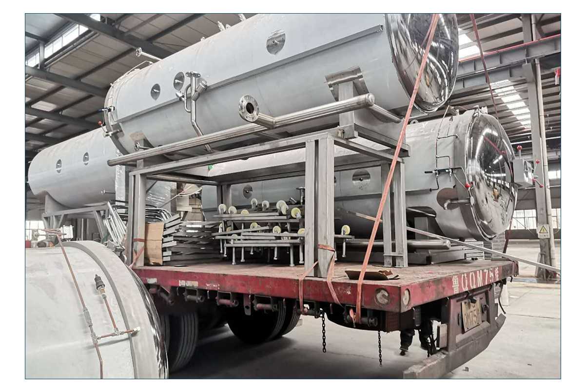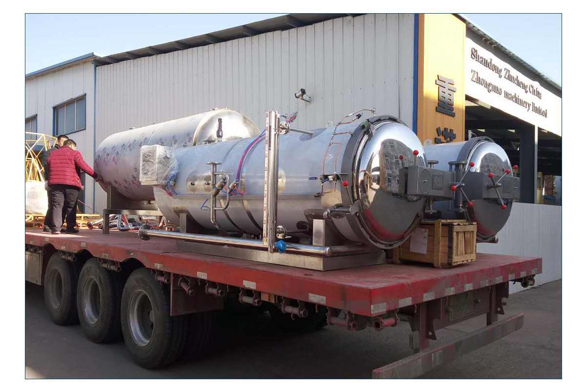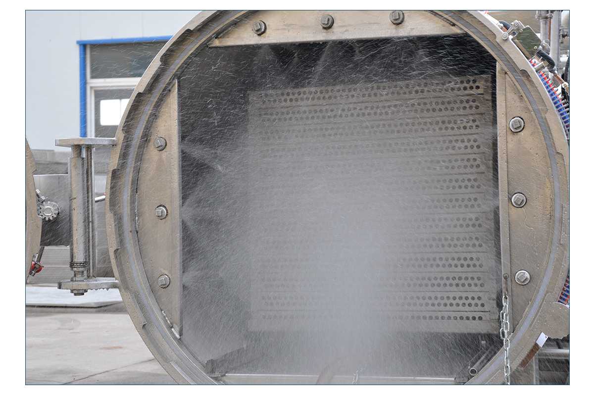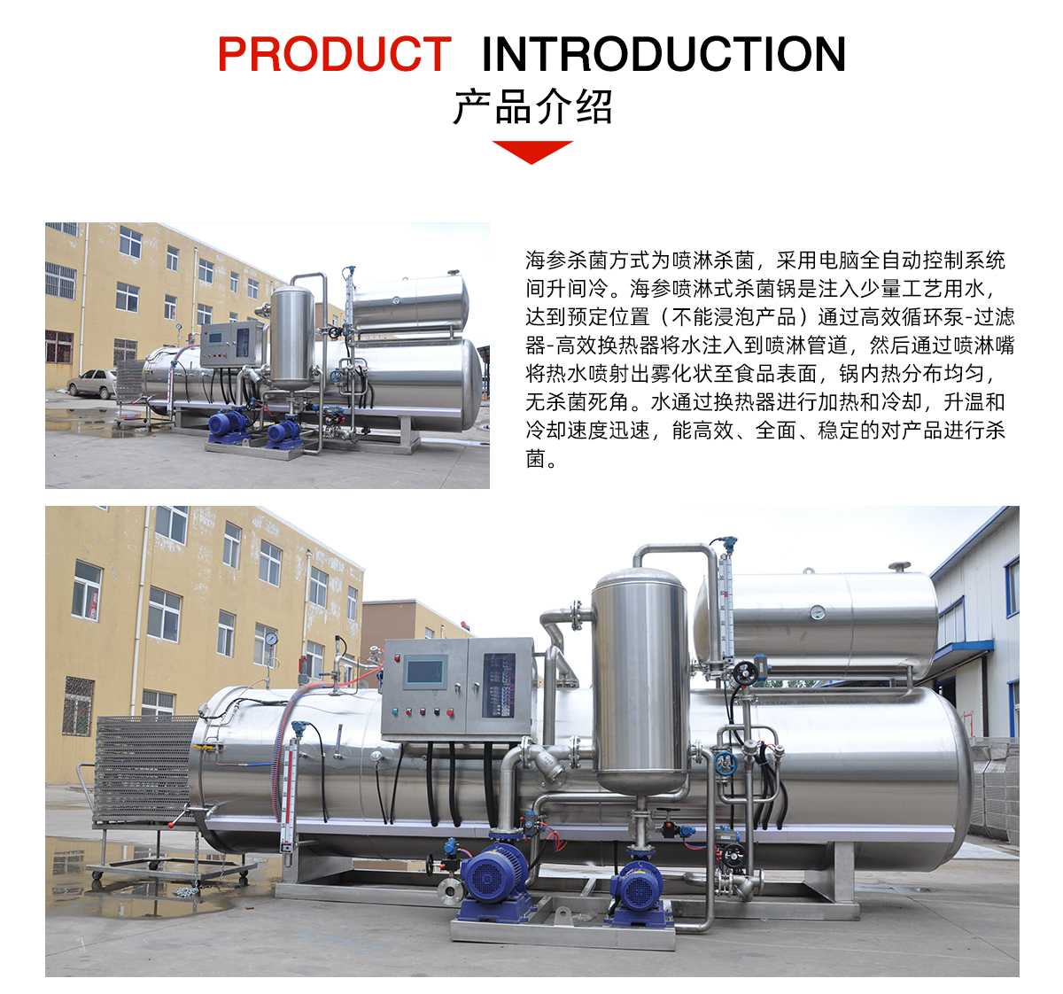 一般罐头食品厂对罐头作常压水煮加热杀菌处理时都采用本形式的卧式杀菌锅,本设备通过引入压缩空气可实现反压杀菌。如冷却需在锅内进行,须用水泵打入锅顶部的喷水管(或采用水循环系统)。