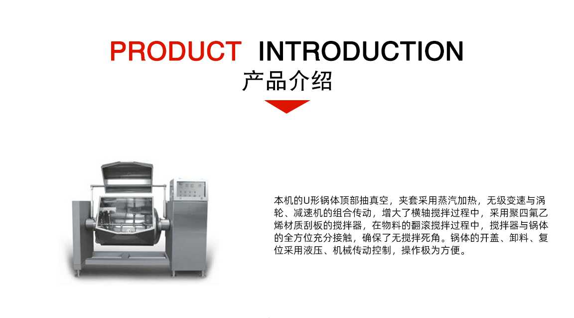 4、带搅拌装置锅体:顶部中心搅拌,减速机输出轴与搅拌桨轴采用活套连接,方便拆装与清洗。
